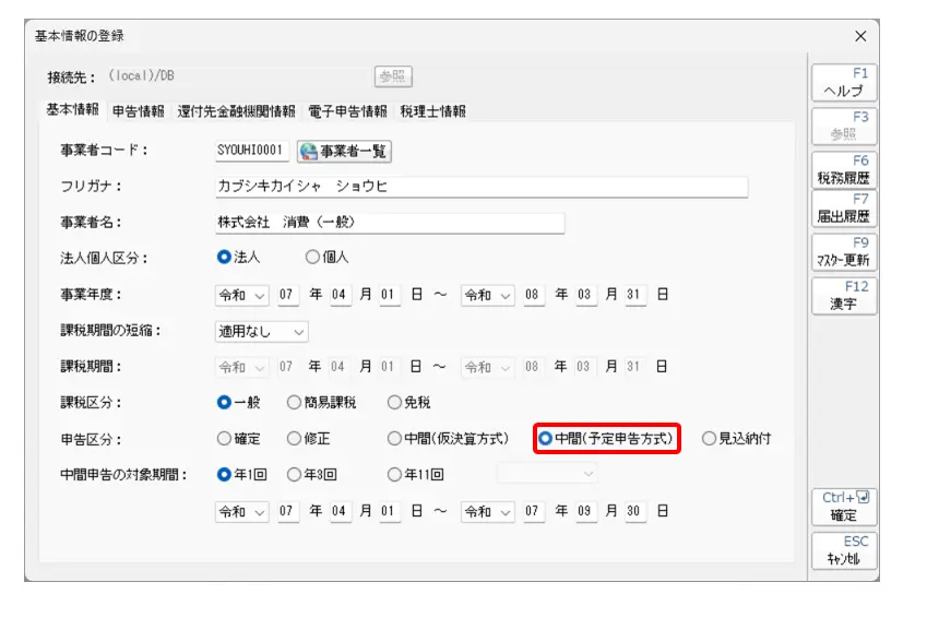 ■「消費税の達人」業務メニューの[基本情報の登録]で申告区分:中間申告(予定申告方式)を選択している場合