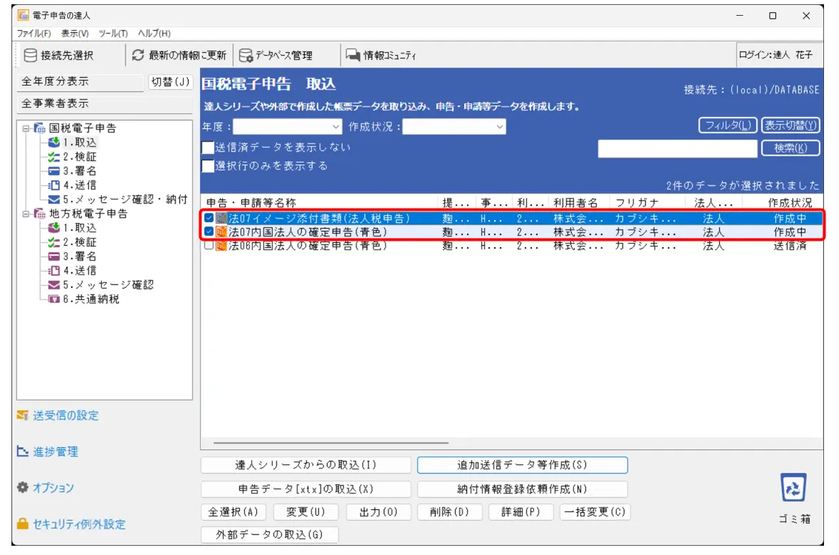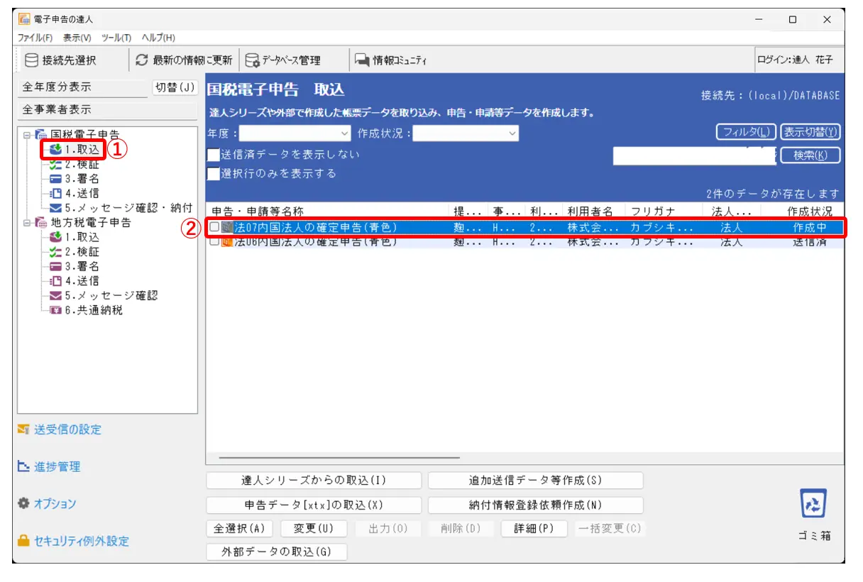 1.電子申告の達人-[国税電子申告]-[1.取込]をクリックし(①)、[作成中]の電子申告データをクリックして選択します(②)。※作成状況は[作成済][署名済]でも操作は可能です。