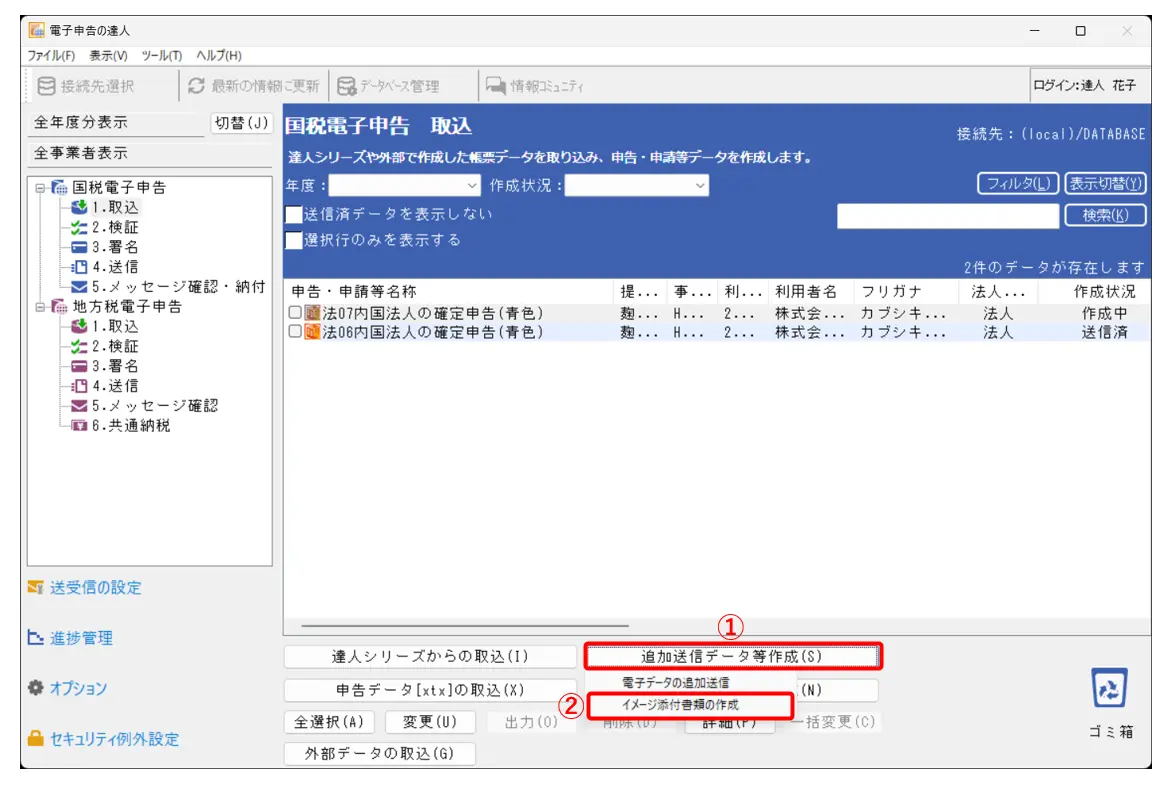 2.[追加送信データ等作成]をクリックし(①)、[イメージ添付書類の作成]を選択します(②)。