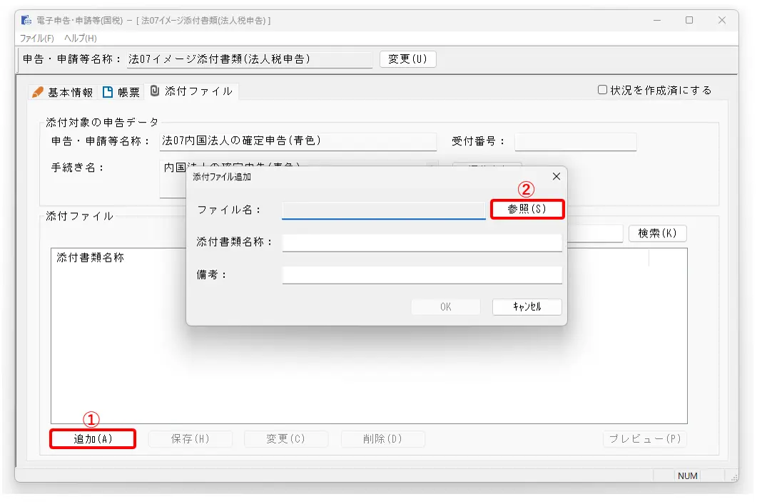 3.[イメージ添付書類]の画面が開きましたら、[追加]をクリックします(①)。[添付ファイル追加]画面の[参照]をクリックし、添付するファイル(PDF形式)を選択します。