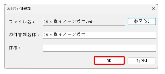4.ファイルの選択を行うと、[添付書類名称]にもファイル名が入ります。確認後、[OK]をクリックします。