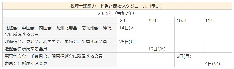 税理士認証カードは下記スケジュールに基づき、順次発送されます。ご所属の税理士会により税理士認証カードの発送開始時期が異なりますので、ご注意ください。