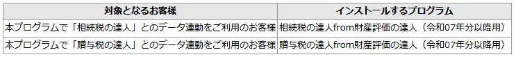 本プログラムの公開に伴い、連動コンポーネントも同日に提供いたします。本プログラムで「相続税の達人(令和07年分以降用)」及び「贈与税の達人(令和06年分以降用)」とのデータ連動をご利用の場合は、必ず最新の連動コンポーネントをインストールしてください。