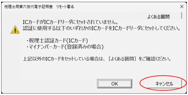 当該エラー画面が表示された場合は、「キャンセル」をクリックすることにより、第五世代税理士用電子証明書(紫色のICカード)で署名を行うことができます。