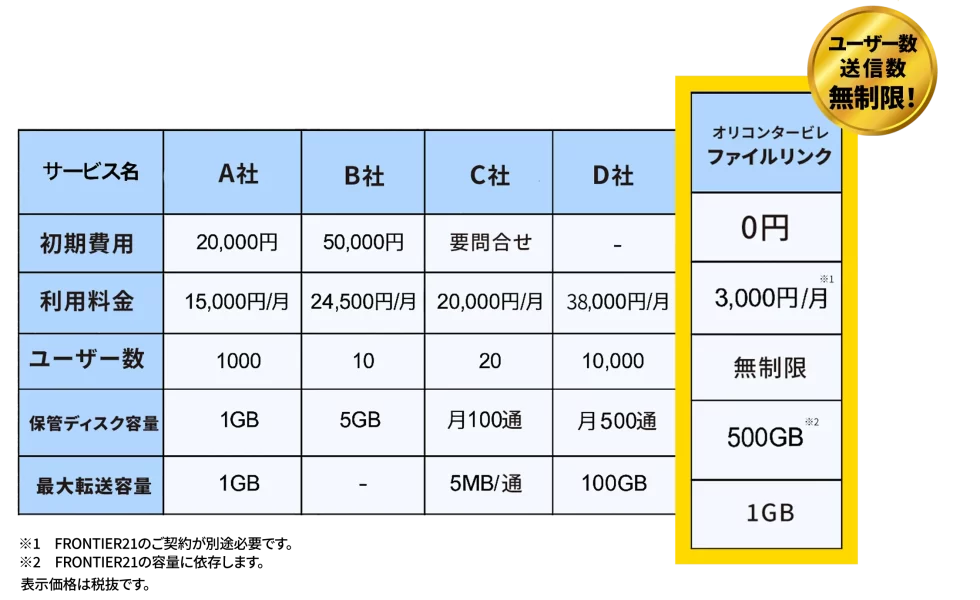 ファイルリンクはFRONTIER21のオプションなので初期費用0円!利用料金も3,000円(税抜)と抜群のコストパフォーマンス。