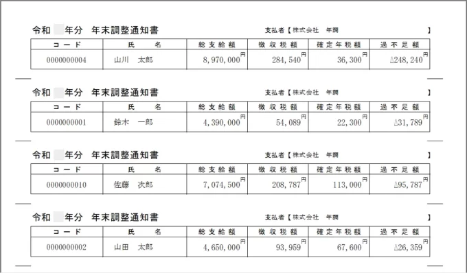 A.「年末調整通知書」が印刷できます。 従業員ごとの氏名、総支給額、徴収税額、確定年税額、過不足額を集計した帳票です。