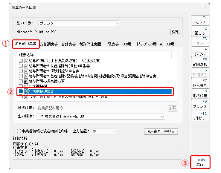 2.[源泉徴収票等]のタブが開かれていることを確認し(①)、[年末調整通知書]を選択し、チェックをいれます(②)。[実行]をクリックします(③)。