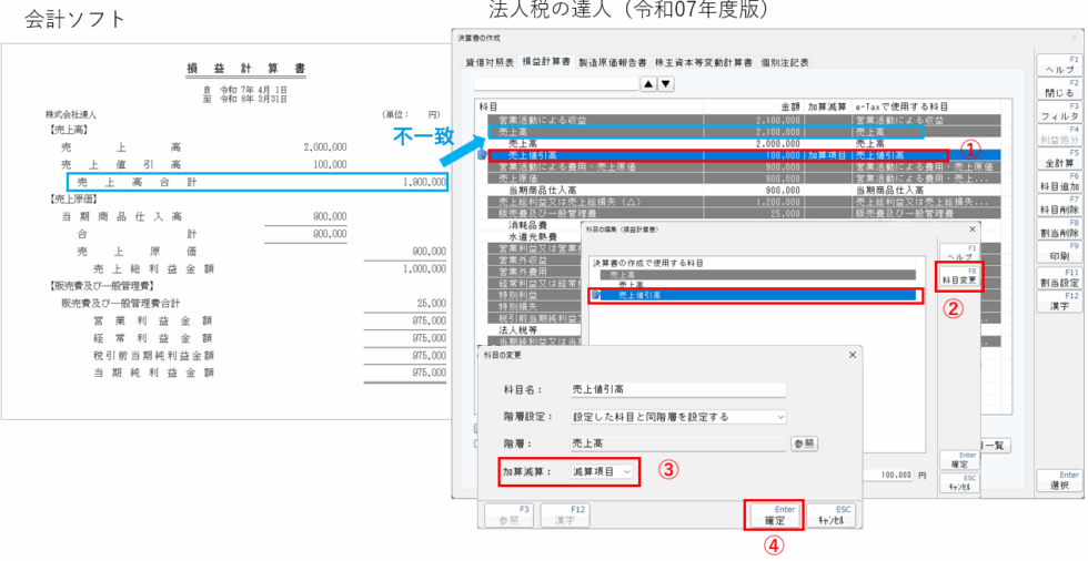 売上値引を【加算】→【減算】に変更する手順 ※会計ソフトと法人税の達人の損益計算書で不一致がないか上から順に確認します。今回は売上高合計が不一致のため、科目【売上値引高】を【減算項目】に変更することで不一致が解消されます。
