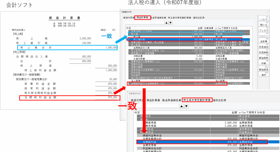 2.【売上値引高】が【減算項目】に変更され、会計ソフトの【売上高合計】と法人税の達人の決算書の【売上高】が一致したことを確認します。「損益計算書」と「株主資本等変動計算書」の[当期純利益]に不一致も解消されました。