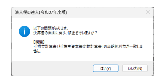 Q.[決算書の作成]画面を閉じようとしたところ、以下のメッセージが表示されます。「損益計算書」と「株主資本等変動計算書」の当期純利益が一致しません。」どうしたらいいですか?