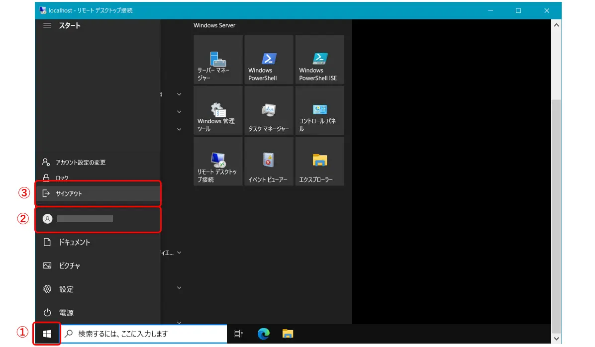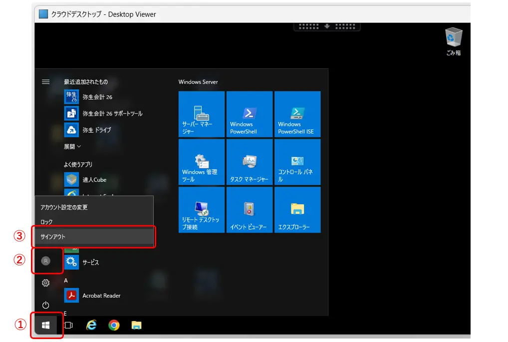 画面左下の[スタート]ボタンをクリックし(①)、[ユーザー]アイコン(②)から[サインアウト]を選択します(③)。
