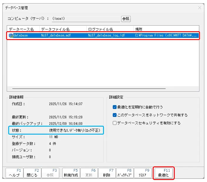 「データベース管理」画面より「最適化」ボタンをクリックしデータベースの最適化を行います。