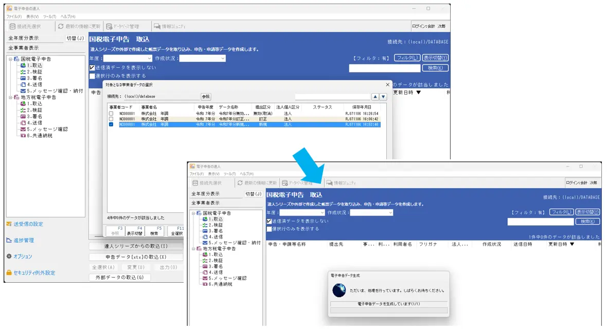 また、電子申告の達人に取込が完了せず、「使用中」となってしまったデータに関しては、以下の手順でデータベースの最適化を行っていただく様お願いいたします。