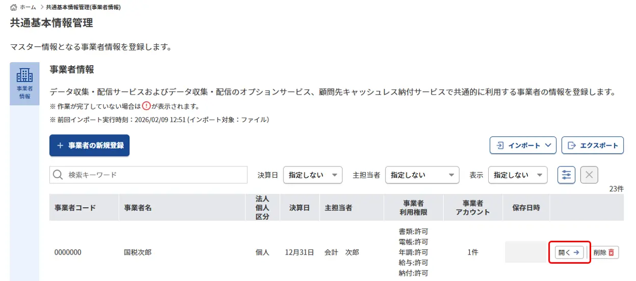 2.該当事業者の「開く」をクリックします。