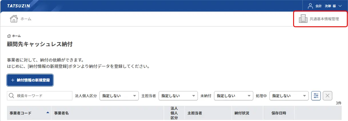 1.達人Cubeから「顧問先キャッシュレス納付」にログインします。画面右上の「共通基本情報管理」をクリックします。