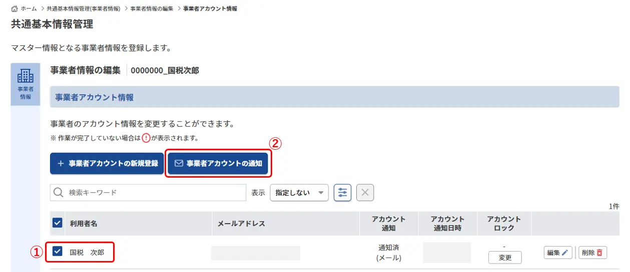 4.利用者名のチェックを入れ(②)、「事業者アカウントの通知」をクリックします(②)。
