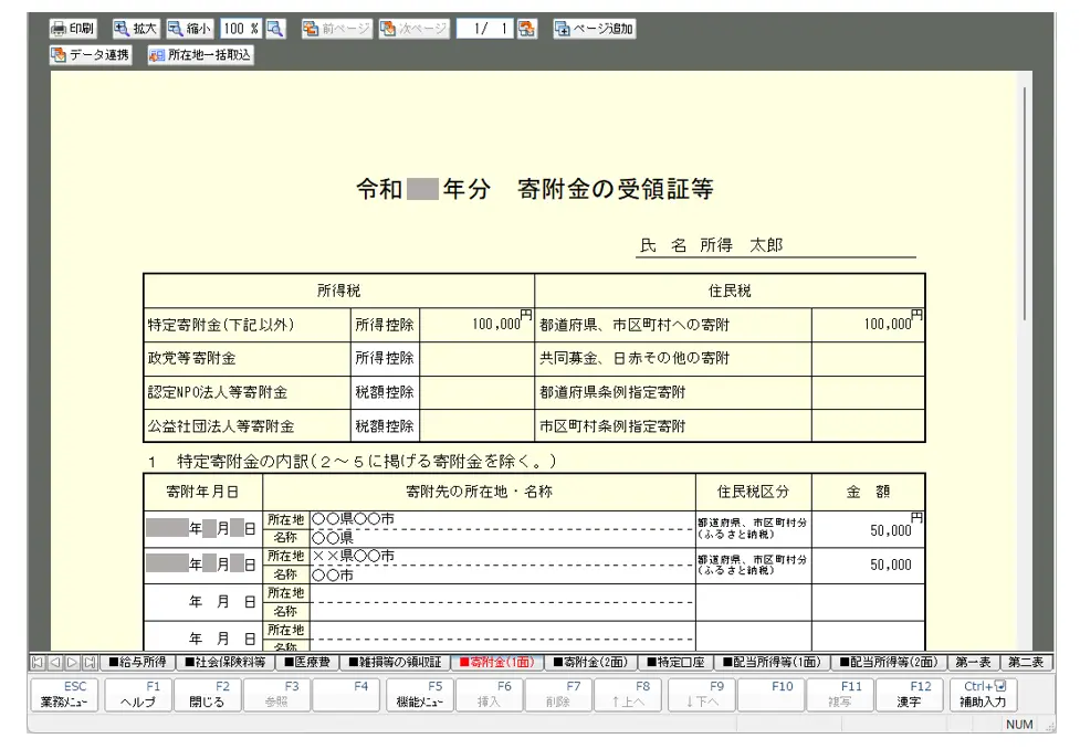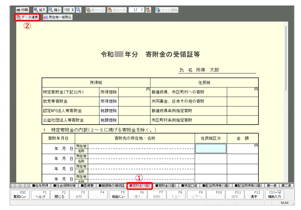1.所得税の達人から[申告書の作成]画面を開きます。入力用帳票:[■寄附金(1面)]タブをクリックし(①)、「寄付金の受領証等」を開きます。[データ連携]をクリックします(②)。