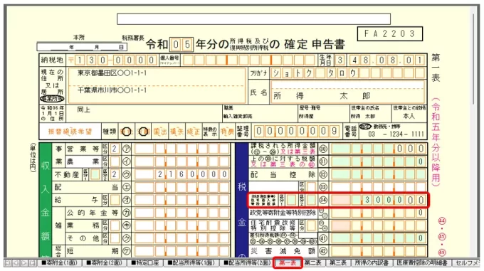 ※ [住宅借入金等特別控除の額の内訳]-[住宅借入金等特別控除可能額]に値がある場合、この数字が「申告書 第一表」に反映されます。[住宅借入金等特別控除可能額]に値がない場合、[住宅借入金等特別控除の額]の数字が反映されます。