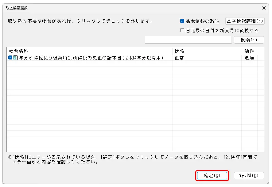 4.取り込み帳票選択画面が表示されましたら、帳票を確認し、[確定]をクリックします。