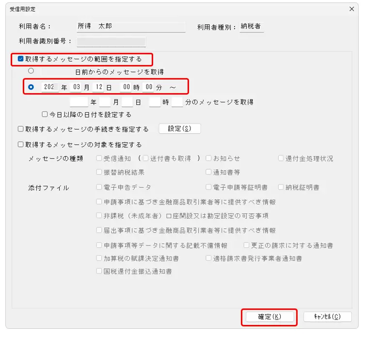 3.[取得するメッセージの範囲を指定する]にチェックを入れます。日付を指定します(「××年××月××日~」のみの設定で問題ございません)。[確定]をクリックし「送受信の設定」画面も閉じます。