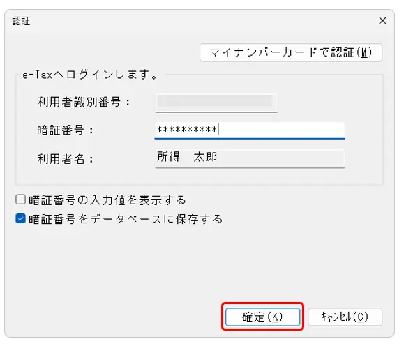 7.認証画面が表示されますので暗証番号を入力し、[確定]をクリックします。e-Taxへログインします。(※画面は個人納税者の場合です)