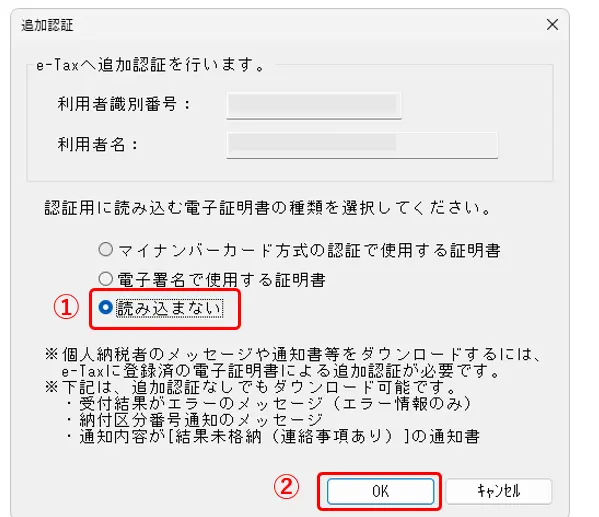 8.個人納税者の場合は、追加認証画面が表示されます。電子証明書は「読み込まない」を選択し(①)、[OK]をクリックします(②)。確認画面が表示されましたら[OK]をクリックします。