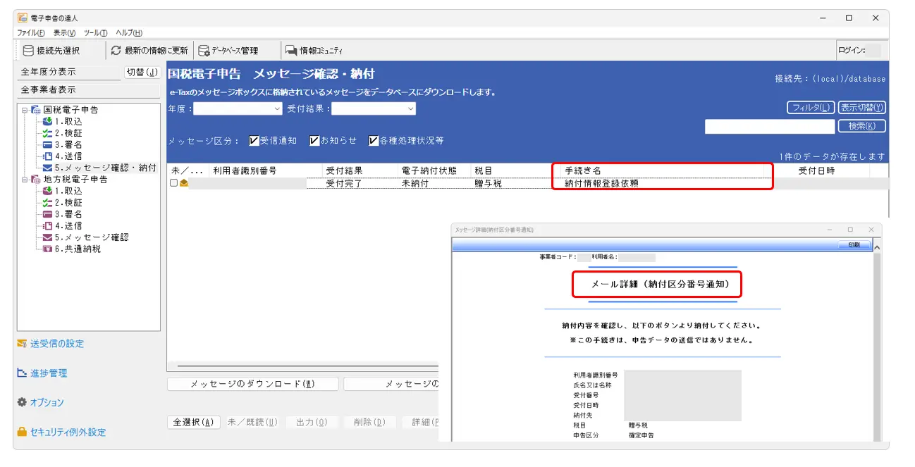 10.メッセージ確認画面に戻りましたら、ダウンロードされた[手続き名:納付情報登録依頼](メッセージを開くと「納付区分番号通知」)を確認します。
